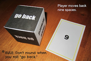 If the second player rolls and the die reads “go forward,” they turn a card over on the deck and round it up or down. If the number is four or less and rounds down to zero, the player must stay at the start. Now it is the first player’s turn again.